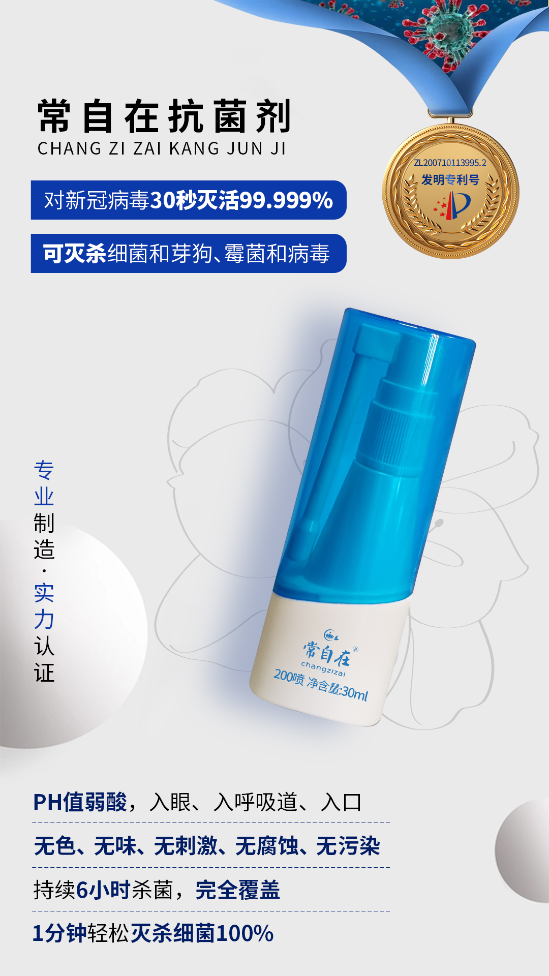 成分:純化水、十二烷基二甲基榮基氯化按、二類基二甲基氯化按。有效殺菌成分及含量:十二烷基二甲基基氯化按、二類基二甲基氯化按活性物含量為0.09%~0.11%(w/w)專利技術(shù):無色無味無刺激,入眼入口入呼吸道,適用于粘膜。預(yù)防守護(hù),一步到位。兩性健康,私密健康,母嬰消殺抗菌,男女私密健康守護(hù)。新冠病毒:30秒消殺百分百治病菌,持續(xù)時間6小時間,安全無任何副作用。預(yù)防消殺:流感病毒、手足口病毒、各種陰道炎、支原體,衣原體全部有效。!