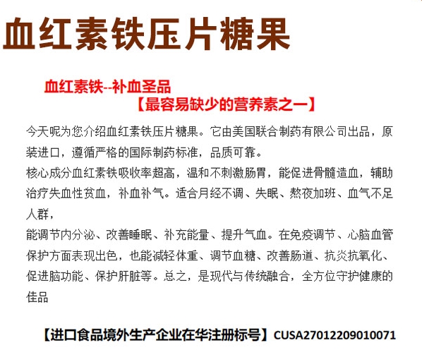 【產(chǎn)品名稱】:血紅素鐵壓片糖果 進(jìn)口產(chǎn)品