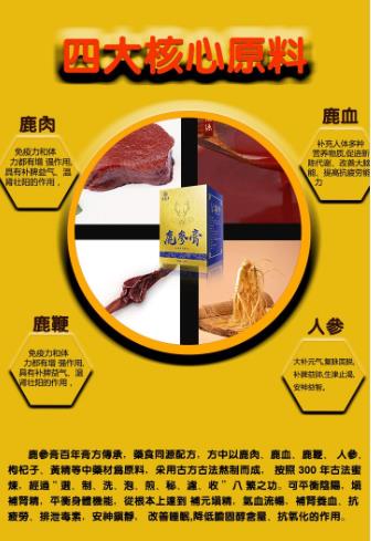 配方:鹿肉、鹿血、鹿鞭、人參、枸杞子、覆
